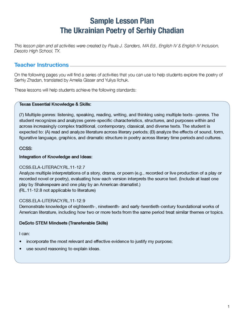 Ms. Sanders wrote the following lesson on the Ukrainian poet Serhiy Zhadan as a way to enable students to engage with current events and hear the voices of those most deeply affected by the war in Ukraine. We are sharing it here in case it can be helpful to any teachers who are looking for ways to help students develop a deeper understanding of what is happening in Ukraine. Ms. Sanders first shared her lesson during a session in which ELAR teachers from DeSoto High School were working with Great Schools Partnership coach Kate Gardoqui to craft this unit on rhetoric from the Ukraine war. Ms. Sanders’ set of activities provide teachers with some powerful ways to use poetry to help students develop a deeper understanding of world events.